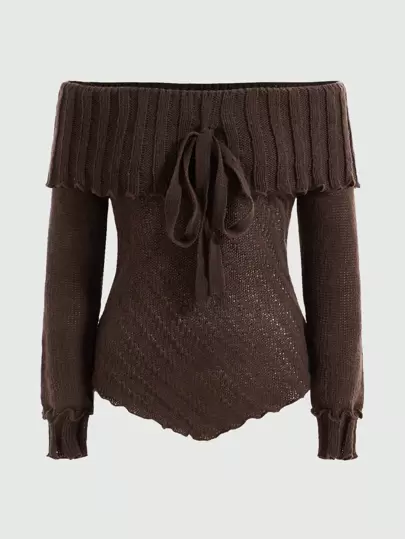 ROMWE Fairycore Foldover Off Shoulder Knot Front Sweater - Brown - View 1