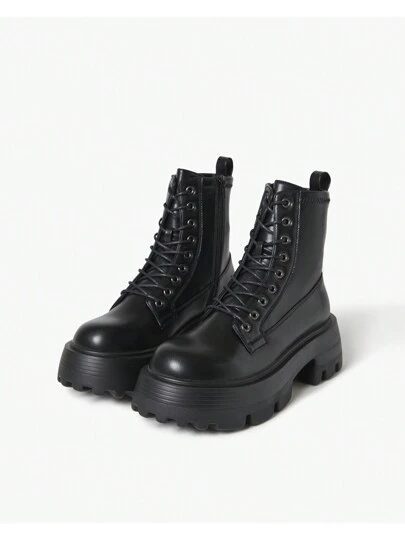 Lug-Sole Combat Booties (Wide) - Black - View 1