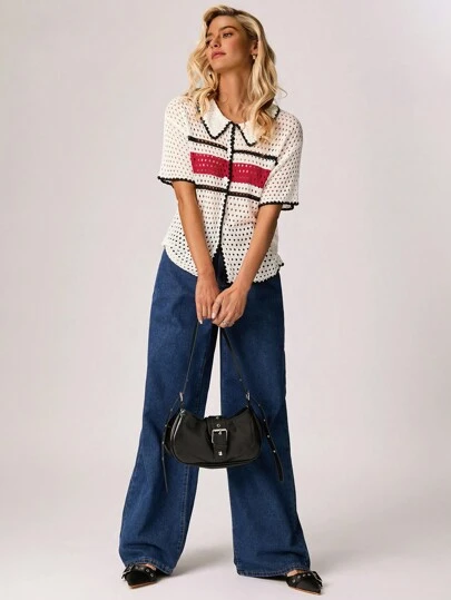 Forever 21 Women Color Block Front Button Up Short Sleeve Hollow Casual Cardigan - White - View 1