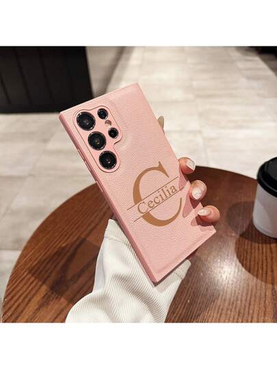 Personalized Customized Name Engrave Big Letter Phone Case Compatible With Galaxy Models S25 S24 S23 S22 S21 S20 Ultra Plus FE A14 A15 A34 A35 A52 A53 A54 A55 Luxury Soft Faux Leather Shockproof DIY Gift - Pink - View 1
