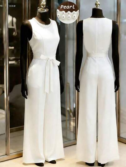 Franclia Minimalist French Style White Round Neck Pearl Embellished Sleeveless Waist Cinched Wide Leg Jumpsuit For Women - White - View 1