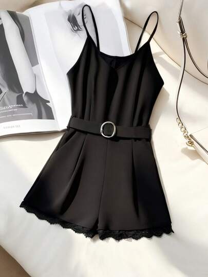 Franclia Women's Spring Wear Jumpsuit, Elegant Summer Vacation Wear Jumpsuit, Women's Elegant Party Jumpsuit, Women's Black Jumpsuit, New Spring Summer Suspender Waist Cinching Slimming Women's Lace Lace Jumpsuit - Black - View 1