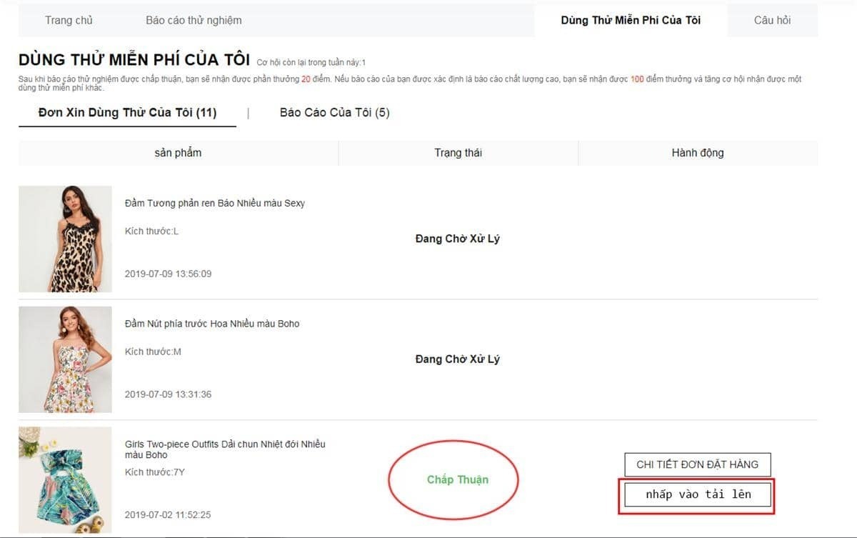 Nếu bạn không thể tải lên báo cáo dùng thử, vui lòng kiểm tra liên kết đã gửi có đúng không. Liên kết phải là một liên kết đến trang sản phẩm dùng thử mà bạn đã nhận được. Kích thước hình ảnh ít nhất là 500 * 680px. Nếu bạn vẫn không thể tải lên, vui lòng viết thông tin bạn muốn và gửi ảnh chụp màn hình của trang không thể tải lên đến địa chỉ email của chúng tôi: