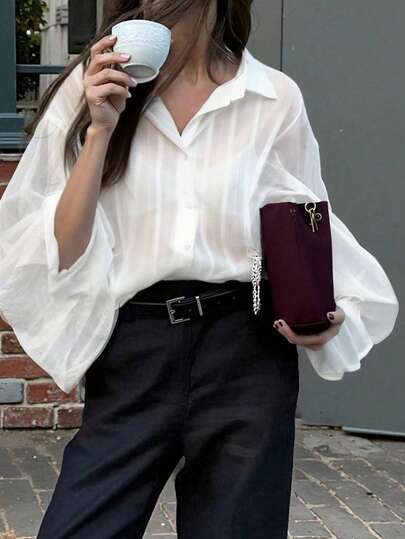French Jacquard Collar Blouse, Loose Fit Bell Sleeve White Shirt For Commuting, Spring/Autumn - White - View 1