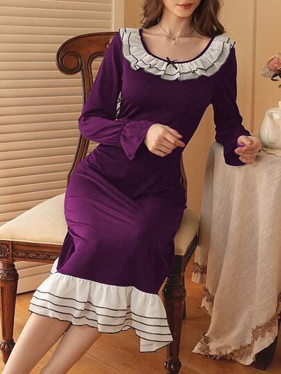 Côtesoire French Romantic Contrast Color Ruffle Hem Women Lounge Dress Holiday Season - Red Violet - View 1