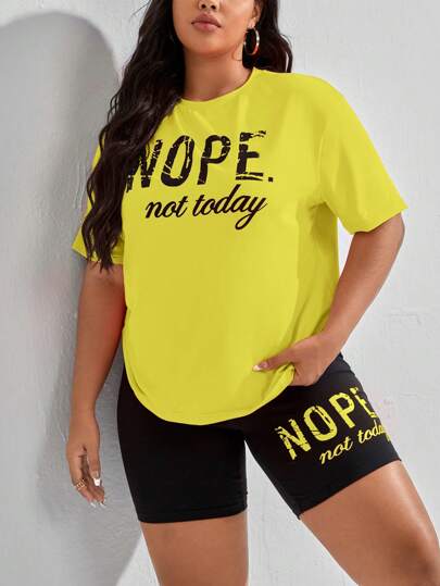 CovetEZ Plus Size Summer Casual Letter Print Short Sleeve T-Shirt And Shorts 2pcs Set - Yellow - View 1