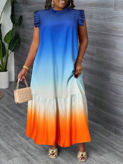 Slaydiva Plus Vacation & Daily Leisure & Daily Outing Loose Gradient Print Sleeveless Ruffle Stitching Ruffle Stitching Stand Collar Women's Plus Size Extra Long Dress 2025 Spring And Summer - Multicolor - View 1