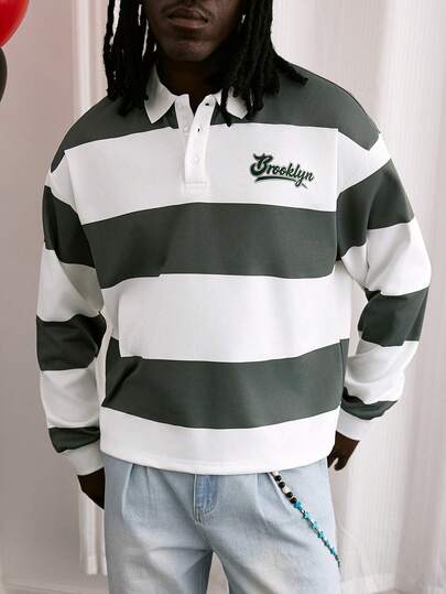 GALLERY FADE Men's Letter Print Striped Long Sleeve Casual Commuter Polo Shirt - White - View 1