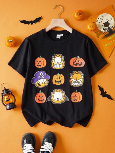 GARFIELD | SHEIN Tween Boy Cartoon Halloween Pumpkin Grid Front Graphic Knit Crew Neck Short Sleeve T-Shirt - Black - View 1