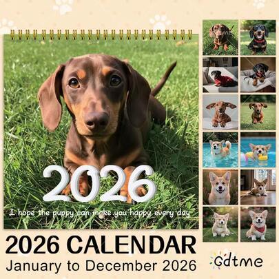 GDTME Cute! Dachshund Pearl Paper Calendar, Golden Metal Ring, 20*20cm, Healing Desktop Decor, Creative Home Accessory: The Calendar Contains Various Adorable Dachshund Photos, Instantly Making Your Living Room Wall Super Cute! Made Of High-Quality Pearl Material, Full Of Happiness Every Day, Easy To Hang, Accompany You To Welcome The New Year! 2026 Calendar - R-313 - View 1