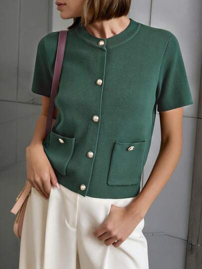 GIGOGOU Women's Casual Knit Cardigan Top With Pockets, Short Sleeve T-Shirt, Spring/Summer - Green - View 1