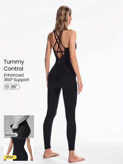 GLOWMODE 26" FeatherFit™ Strap It Good Tummy Control Crisscross Strap Open Back Movement Romper Bodysuit Light Support Low Impact - Black - View 1
