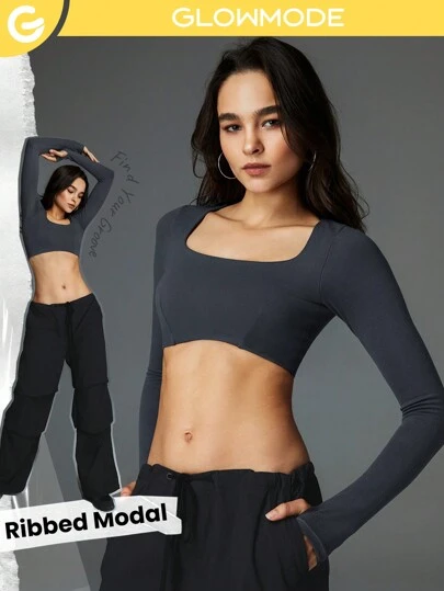 GLOWMODE Ribbed Modal Square Neck Long Sleeve Ultra Crop Top With Thumbhole - Iron Gray - View 1