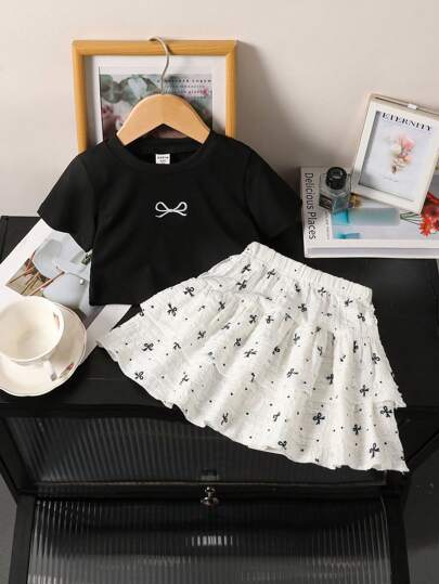 Genkimix Kids Young Girls' Bow Print Round Neck Short Sleeve T-Shirt And Sweet Mini Skirt Set, Fresh Summer Holiday, Beach, Outing Summer Holiday - Black - View 1
