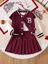 Genkimix Kids 2pcs Young Girls' Early Autumn Navy Blue Solid Color Knit Cardigan Soft Sweater Jacket And Apricot Pleated Skirt, Suitable For Outings, School Season, Also Suitable For Spring And Autumn