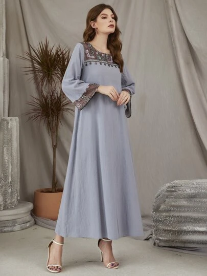 Al Najma Geo Decor Detail Tunic Modest Long Sleeve Dress - Grey - View 5
