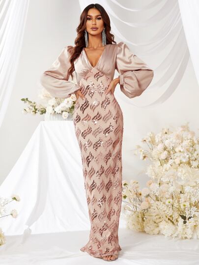 YISIKADO Lantern Sleeve Split Back Sequin Formal Dress - Apricot - View 1