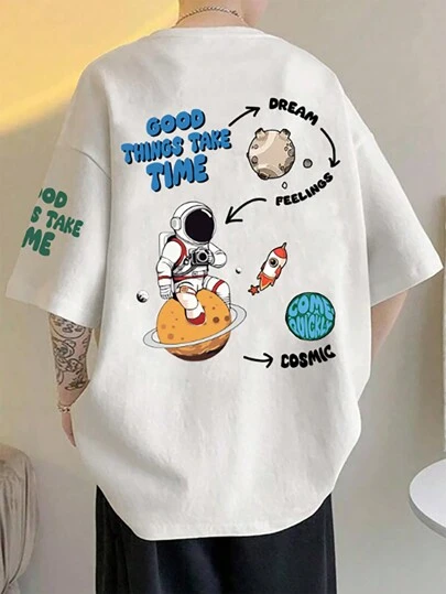 Claim Dot Men Summer Sport Casual Loose Fit Funny Astronaut And Letter Graphic Print Short Sleeve Round Neck T-Shirt, For Going Out, For Friends - White - View 1