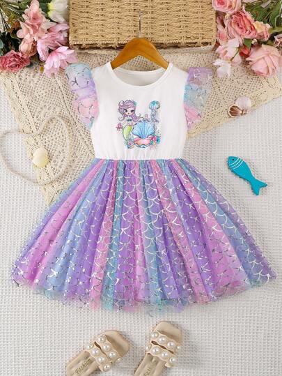 Girl Mermaid Style Mesh Dress, Cute & Elegant Design, Suitable For Girls Party Wear In Summer - Purple - View 1