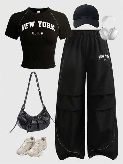 Girlism Teen Girl English Text Print Patchwork Reflective Tape T-Shirt And Pants Casual Suit - Black - View 1