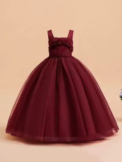 Tween Girls Solid Color 3D Floral Mesh Long Elegant Formal Dress, Suitable For Parties, Hosting Events, Without Headband - Burgundy - View 1