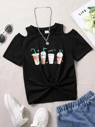 Girls Beverage & Letter Graphic Cold Shoulder Tee - Black - View 1