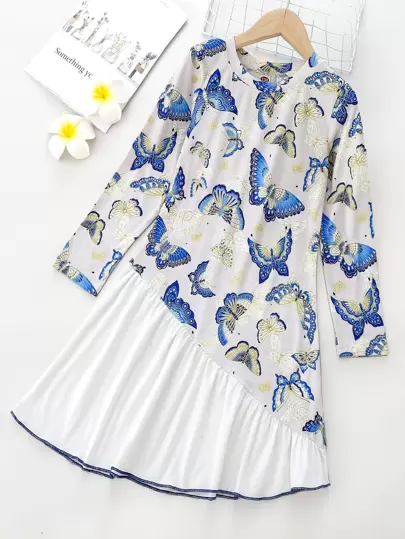 Girls Butterfly Print Ruffle Hem Dress - Multicolor - View 1