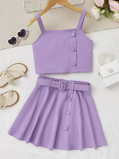 SHEIN Girls Button Front Cami Top & Belted Skirt - Lilac Purple - View 1