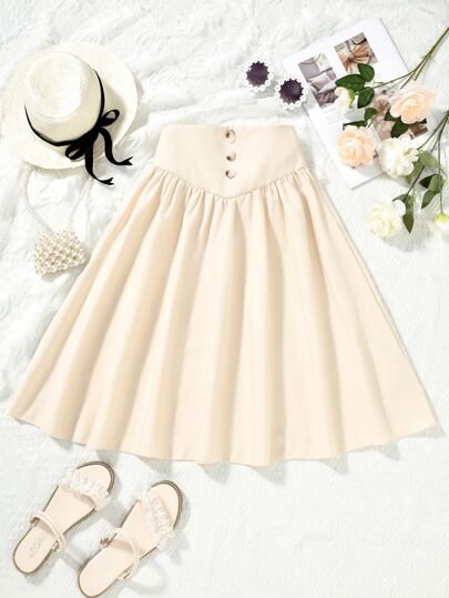 Girls Button Front Flare Skirt - Khaki - View 1