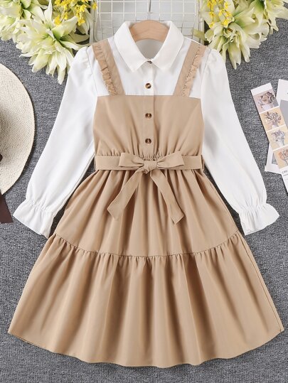 SHEIN Girls Colorblock Flounce Sleeve Ruffle Hem Belted 2 In 1 Dress - Multicolor - View 1