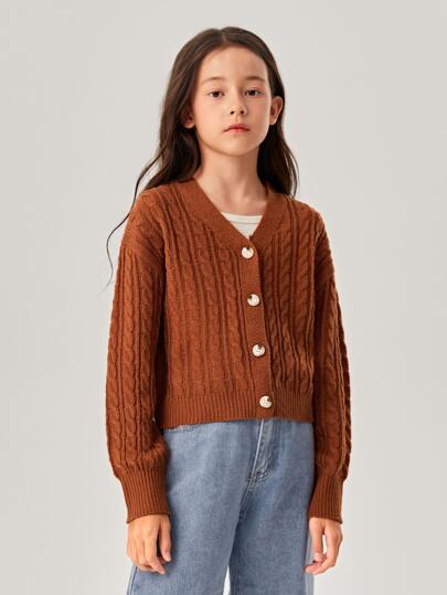 Girls Drop Shoulder Cable Knit Cardigan - Rust Brown - View 1