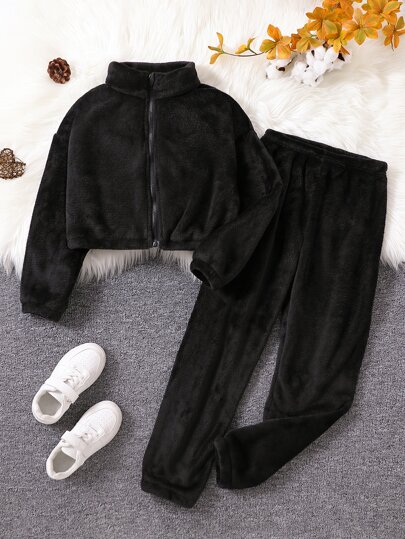 Tween Girl Drop Shoulder Teddy Jacket & Pants - Black - View 1