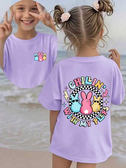 Girls Easter Chilling With My Graphic Tee, Casual Versatile Short Sleeve T-Shirt With Rabbit, Checkered, Lightning Cartoon Prints, Summer - Mauve Purple - View 1