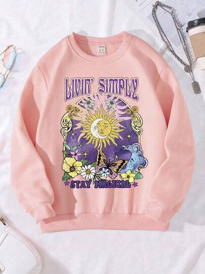 SHEIN Tween Girls' Floral & Butterfly Printed Round Neck Sweatshirt For Autumn - Pink - View 1