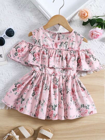 Girls Floral Print Cold Shoulder Ruffle Hem Peplum Blouse - Pink - View 1