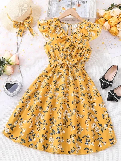 Girls' A-Line Ditsy Floral Dress With Flared Hem And Flutter Sleeves, Summer, Comes With Waist Belt - Mustard Yellow - View 1