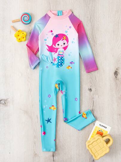 Girls Mermaid Print One-Piece Long Sleeve Swimsuit - Multicolor - View 1