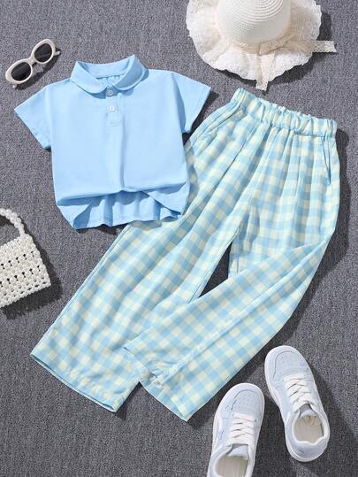Girls' Plaid Polo Shirt And Pants 2 Pieces Casual Set, Summer - Blue - View 1
