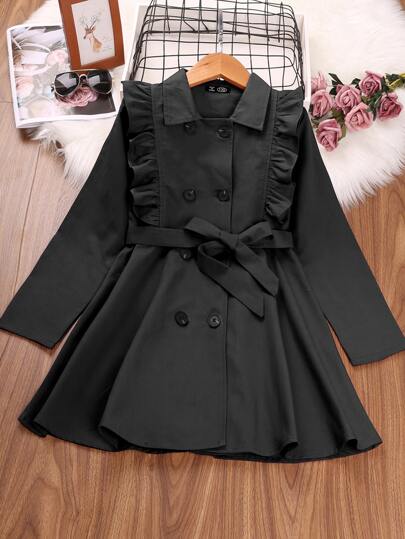 Girls Ruffle Trim Double Breasted Belted Trench Coat - Black - View 1