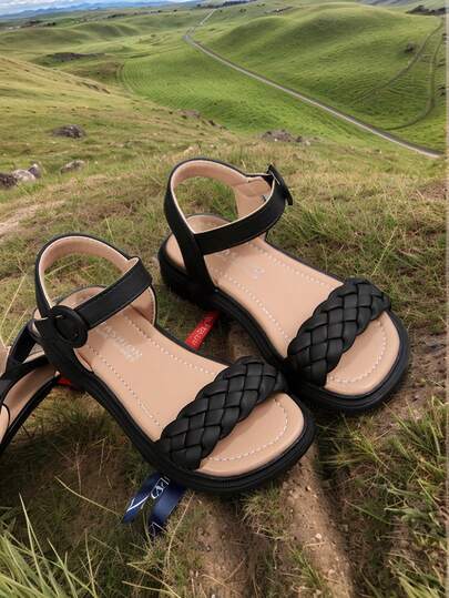 Girls Sandals Summer 2025 New Kids Woven Shoes Soft Sole Toddler Beach Shoes Big Children Shoes - Black - View 1