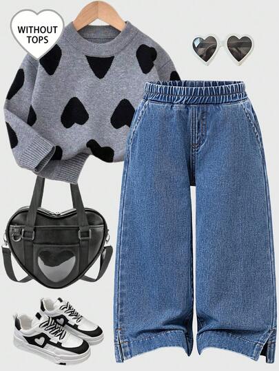 Girls (Small) New Casual Fashion Simple Versatile Side Slit Washed Blue Denim Straight Leg Jeans - Blue - View 1