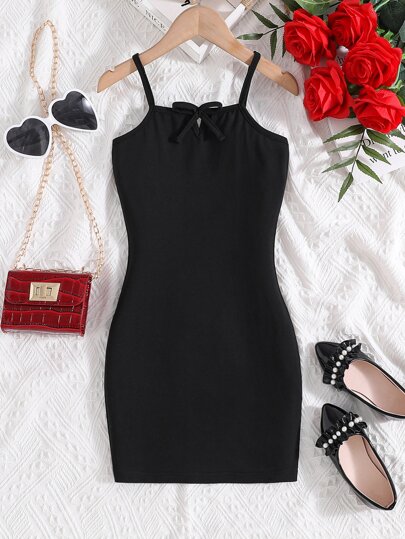 Girls Solid Bow Front Cami Dress - Black - View 1