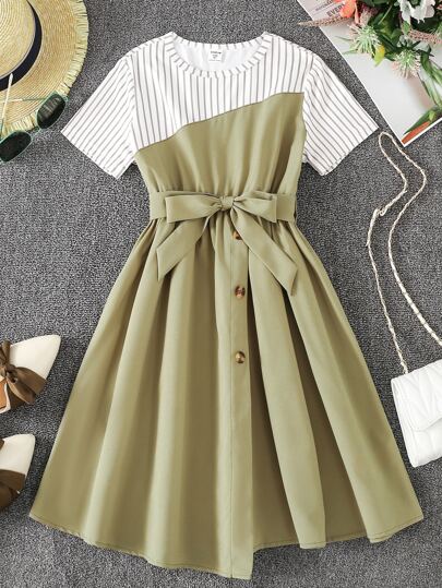 SHEIN Girls Striped Panel Belted Dress - Multicolor - View 1