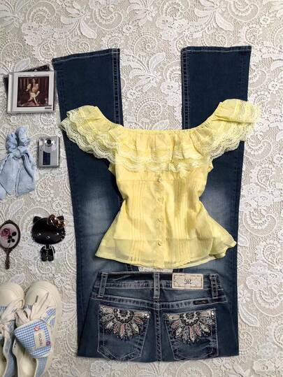 Glimmora Women's Double-Layer Ruffle Lace Trim Polka Dot Off-Shoulder Yellow Blouse - Yellow - View 1