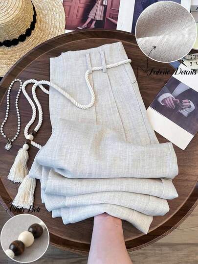 GlowEve Women's Bamboo Texture Fabric Paired With Wooden Bead & Tassel Drawstring Wide Leg Pants, Casual Daily Vacation Commute Business Fashion Holiday Date French Street Retro Versatile Light Gray Early Spring/Spring Summer New Wide Leg Pants - Grey - View 1