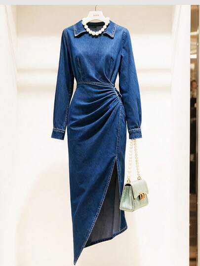 GlowEve Women's Collared Long Sleeve Ruched Side Slit Hem Fitted Denim Dress - Blue - View 1