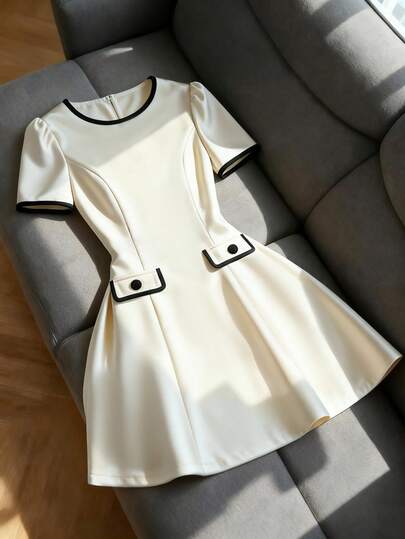 GlowEve Women's Crew Neck Short Puff Sleeve Waist Button Design Elegant Dress - White - View 1