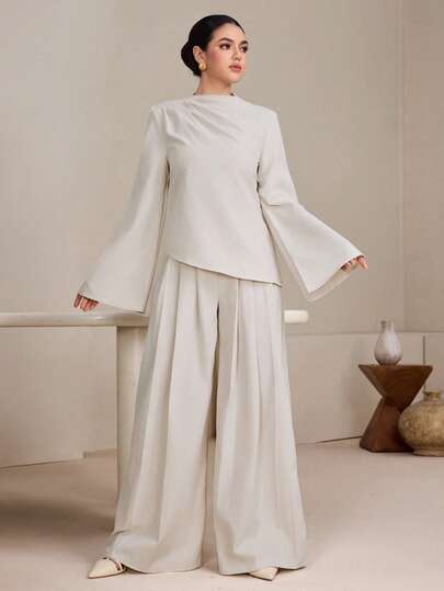 Graceveil Apricot Minimalist Commuter High-Intelligence Minimalist Designer Muslim Women's 2 Pieces Set Modest Modest Sets For Women Wide Leg Pants Set Modest Two Piece Set Japandi Style Clothing - Apricot - View 1