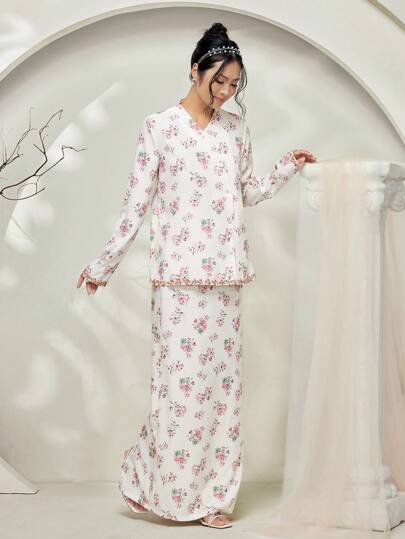 Graceveil Baju Kebaya Floral Print V-Neck Long Sleeve Top And Long Skirt Bohemian Set Modest - Apricot - View 1