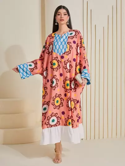 Al Najma Graphic Print Batwing Sleeve Ruffle Hem Dress Kaftan Jalabiya Dress - Multicolor - View 1